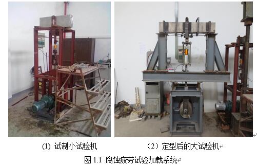 混凝土梁腐蝕疲勞試驗系統(tǒng)分為動力設備、計數(shù)設備、控制設備以及腐蝕箱等關鍵設備,能對尺寸較小的梁式試件進行加載(圖1.1(1))。試制成功之后,又制作相同原理的另一套試驗設備,能對大尺寸梁進行加載(圖1.1(2))。