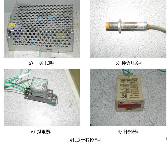 計數(shù)設備由開關電源、繼電器、計數(shù)器和接近開關組成,各部分見圖1.3。在偏心輪上粘貼一塊鐵片或者鋁片(見圖1.2(c)),當鐵片或者鋁片經(jīng)過接近開關時,繼電器被觸發(fā),計數(shù)器數(shù)字增大一個,如此來記錄偏心輪轉動的圈數(shù),即加載次數(shù)。