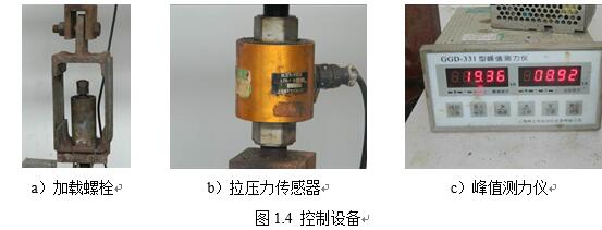 控制設備包括加載螺栓、力傳感器以及峰值測力儀等組成,見圖1.4。峰值測力儀采用上海梅立克自動化儀表有限公司生產(chǎn)的型號為GGD-331峰值測力儀,力傳感器為5t的拉壓力傳感器。旋轉加載螺栓對加載最大荷載進行控制,加載的最大荷載經(jīng)拉壓力傳感器的感應,從峰值測力儀顯示最大力。峰值測力儀左側顯示的是每次循環(huán)加載中的最大荷載(小于10kN不顯示),右側圍動態(tài)顯示實時加載力。